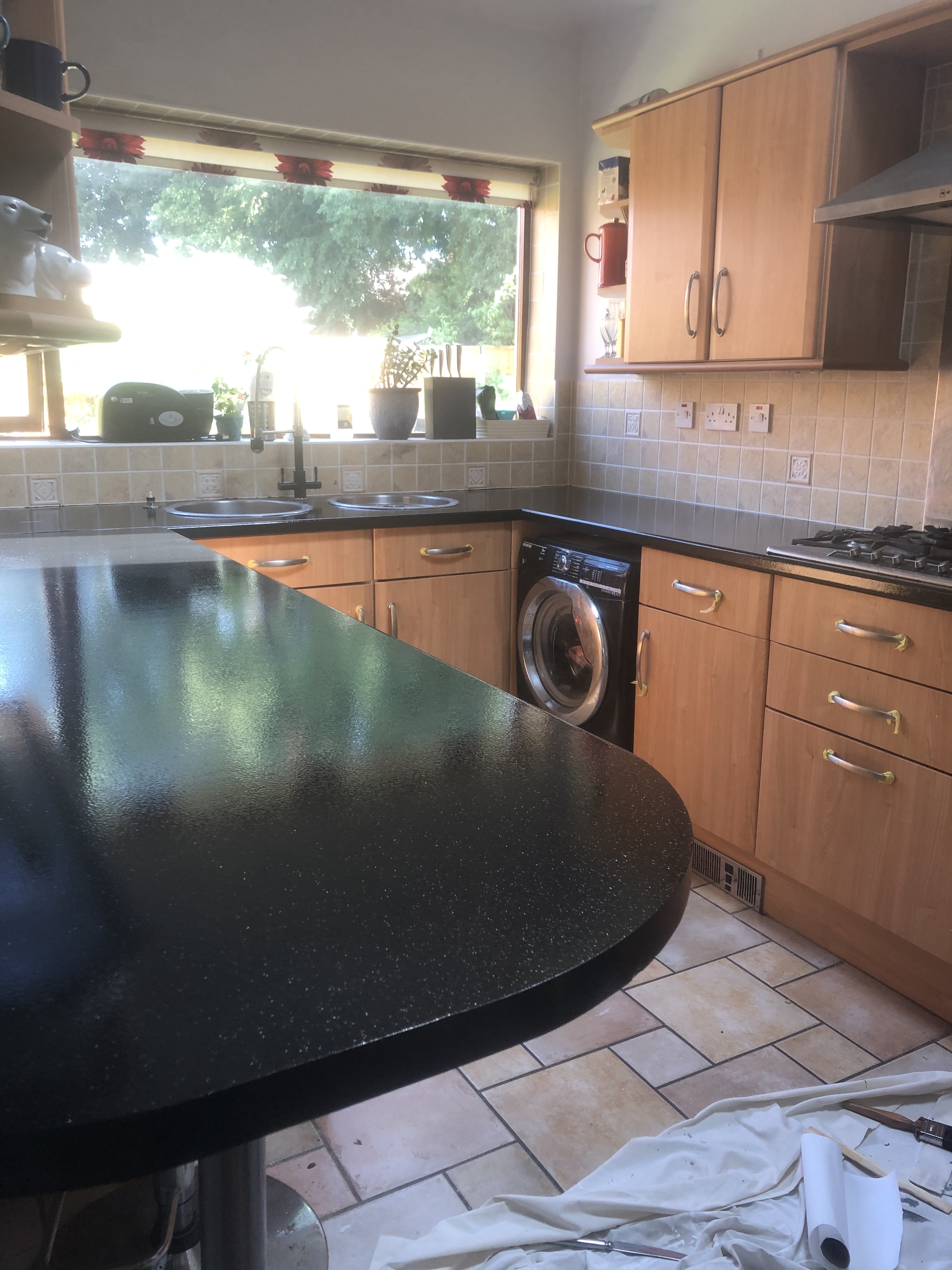 I wasn’t a big fan of the green colour of the work surface. It’s nothing expensive – just a wrap over a wooden base – so I wasn’t precious about changing it up. Research told me they could be painted. After some deliberation, I decided on the Galaxy Black kit from Rust-Oleum Kitchen Worktop Transformations. I ordered from Andrews Coatings, and the total cost including delivery was £84.22. It took a while for this to arrive, but it was ordered at the peak of lockdown!
